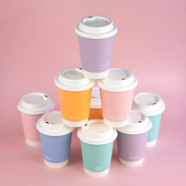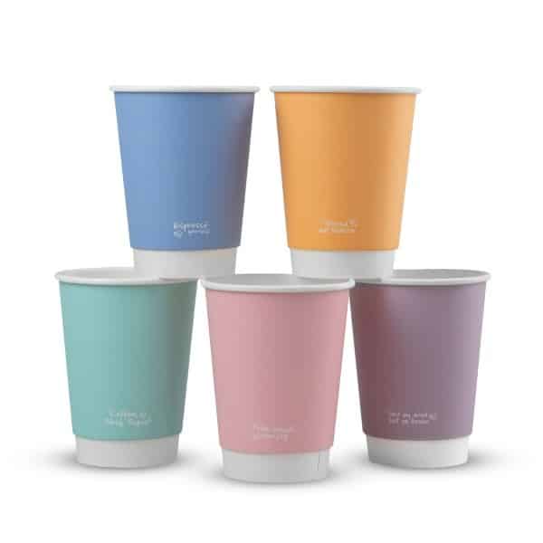 Double wall hot cup. Fits Vegware’s 89-Series lids. For coffee, tea and all hot drinks, or soup to go. Two layers of sustainably-sourced board with a plant-based PLA lining. Available in a mixed sleeve of five cheerful colours. Each cup includes a feel good message​. Award-winning quality by Vegware, made from plants. Designed for industrial composting; recyclable in coffee cup recycling schemes – check your local options.