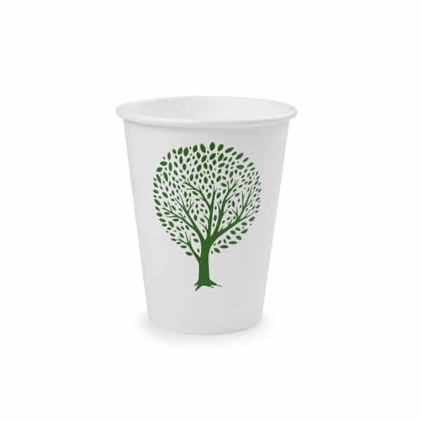 A home compostable 12oz single wall hot cup in our revamped Green Tree design! For coffee, tea and all hot drinks, or soup to go. Sustainably-sourced board, lined with a water-based lining. Crisp white board with tree in Vegware green. Award-winning quality, made from plants. Designed for home or industrial composting, recyclable in coffee cup recycling schemes – check your local options.