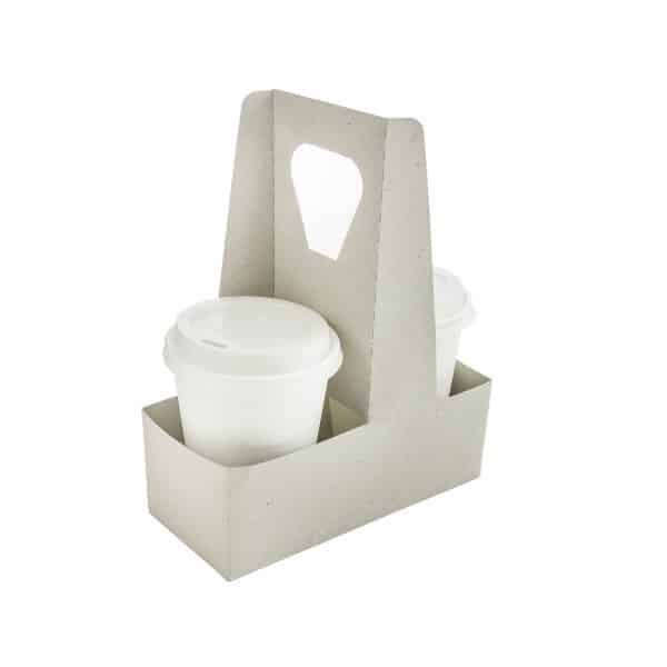 A handy tray for carrying two cups. sticker, or your own custom design.Made from recycled pulp. Pale unbleached grey. Award-winning quality by Vegware, made from plants. Designed for industrial composting, made from recyclable materials.