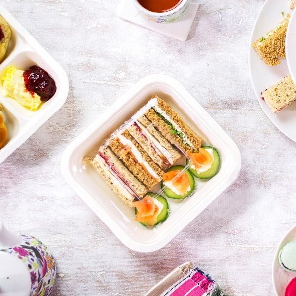 Versatile tray base for food to go. Part of Vegware’s Gourmet range, size 4. Multiple lid options. Space efficient stacking. Great for hot or cold, and sturdy enough to load up with food. Ideal for street food and festivals. This moulded fibre product uses reclaimed natural material such as sugarcane, bamboo or wood pulp. Stylish white. Award-winning quality by Vegware, made from plants. Made from recyclable materials.
