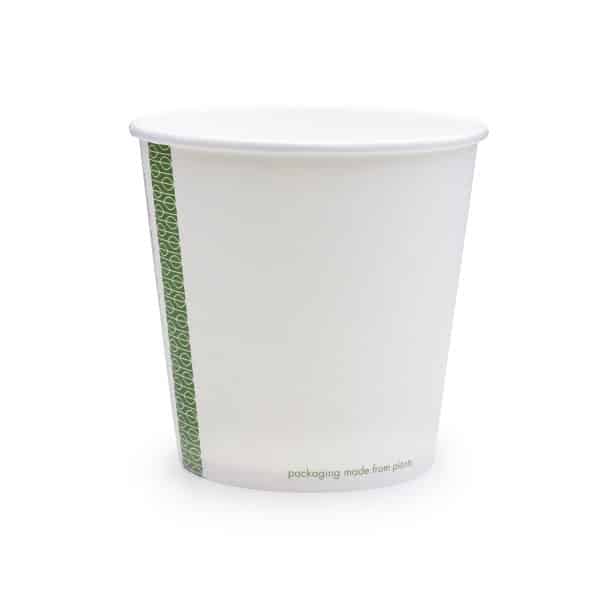 Versatile, leak-proof, sturdy round tub. Fits Vegware’s 115-Series lids. For hot soups, pasta, noodles, porridge or one-pot meals, or for cold salads or ice cream. Sustainably-sourced board with a plant-based PLA lining. Crisp white, with Vegware messaging in green. Award-winning quality by Vegware, made from plants. Designed for industrial composting, made from recyclable materials.