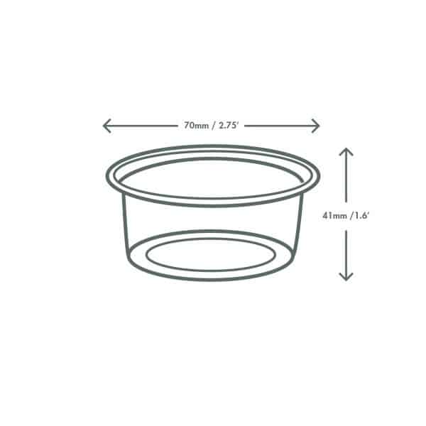 Round portion pot. One flat lid fits all sizes, for a great seal and easy stacking. For cold toppings or sauces, mini snack or protein pots, or sampling. Made from PLA, a renewable material made from plants. Clear for visibility. Award-winning quality by Vegware, made from plants. Commercially compostable where accepted.