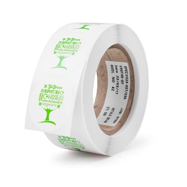 A 45mm round sticker. Great for sealing bags or paper wraps. Made from paper with a compostable adhesive. Part of the Green Tree collection. Award-winning quality by Vegware, made from plants. Commercially compostable where accepted.