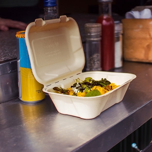 Practical and stylish clamshell, in Vegware Nourish moulded fibre. Doesn’t trap condensation, so hot food stays crispy. For hot or cold food to go – street food, fried rice, salads, or even sweet treats. Made from Vegware Nourish moulded fibre with no added PFAS. Our moulded fibre uses reclaimed natural material such as sugarcane, bamboo or wood pulp. Oatmeal colour for a natural look. Award-winning quality by Vegware, made from plants. Designed for home or industrial composting, made from recyclable materials.