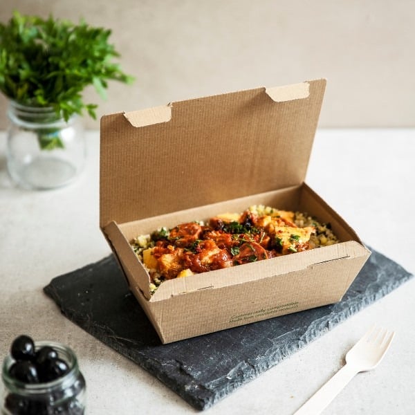 Premium performance hinged box to retain heat. Lightweight, sturdy and stackable. Ideal for hot or cold, for delivery or food to go. Suitable for hot cabinets. Made from microflute corrugate board with a compostable inner coating. Plain brown kraft colour with Vegware branding. Award-winning quality by Vegware, made from plants. Designed for industrial composting, made from recyclable materials.