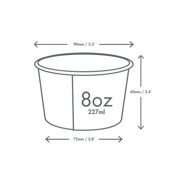 Versatile, leak-proof, sturdy round tub. Fits Vegware’s 90-Series lids. Ideal for serving ice cream! Also great for hot sauces or sides. Sustainably-sourced board with a plant-based PLA lining. Crisp white, with Vegware messaging in green. Award-winning quality by Vegware, made from plants. Designed for industrial composting, made from recyclable materials.