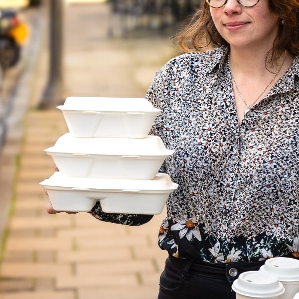 Stylish clamshell, in Vegware Nourish moulded fibre. Doesn’t trap condensation, so hot food stays crispy. For hot or cold food to go – street food, fried rice, salads, or even sweet treats. Made from Vegware Nourish moulded fibre with no added PFAS. Our moulded fibre uses reclaimed natural material such as sugarcane, bamboo or wood pulp. Stylish white. Award-winning quality by Vegware, made from plants. Designed for home or industrial composting, made from recyclable materials.