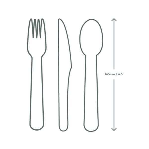 A kit of sturdy wooden cutlery – knife, fork, spoon, with a napkin. Great for hot or cold foods, and sturdy and strong enough to set into crunchy meals. Excellent for takeaway foodservice. The unbleached napkin is made from recycled paper. Wrapped in matt kraft paper with on-pack Vegware messaging in green. Award-winning quality by Vegware, made from plants. Commercially compostable where accepted.