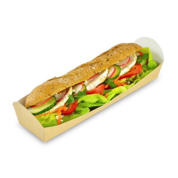 Versatile board tray for food to go. For baguettes, hot dogs, nachos, churros and more. Handy for portion control, from street food to stadiums. Sustainably-sourced card. Kraft brown colour. Award-winning quality by Vegware, made from plants. Designed for industrial composting, made from recyclable materials.