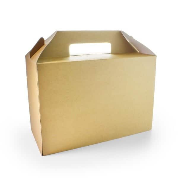 Sturdy fold-out card box with carry handles. Easy to assemble. Perfect for picnics or meals to go. Made from sustainably-sourced board. Classic brown colour. Award-winning quality by Vegware, made from plants. Designed for industrial composting, made from recyclable materials.