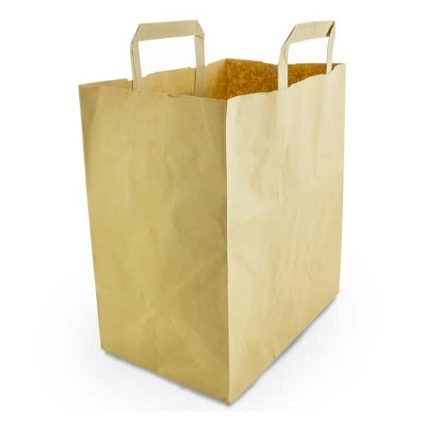 Sturdy recycled paper carrier bag with internal tape handles. Ideal for food to go. 100% recycled unbleached paper. Brown kraft colour. Award-winning quality by Vegware, made from plants. Designed for industrial composting, made from recyclable materials.
