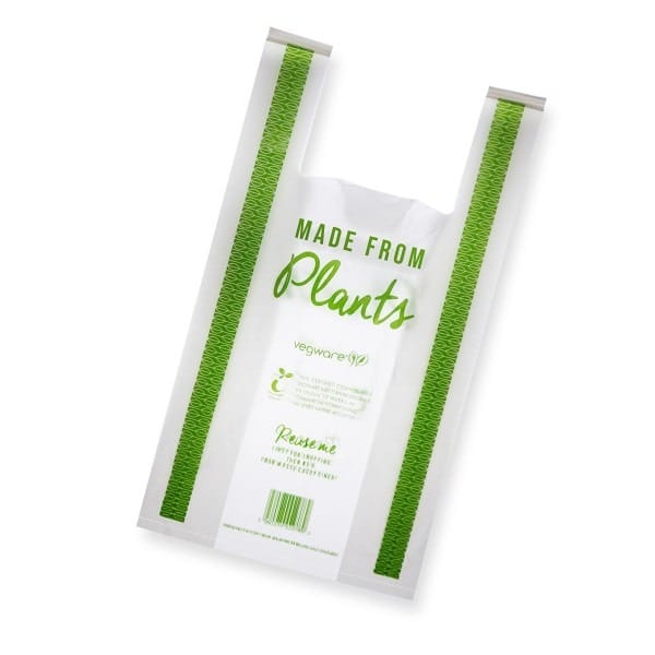 Strong compostable carrier bag with a barcode for retail. Ideal for groceries, food to go, or hot takeaway containers, and then for reuse as a food waste caddy liner in your kitchen. Made from a blend of PLA and PBAT. Translucent white with a green print, ‘Made from plants’ and encouraging reuse for food waste caddies. Award-winning quality by Vegware, made from plants. Commercially compostable where accepted.