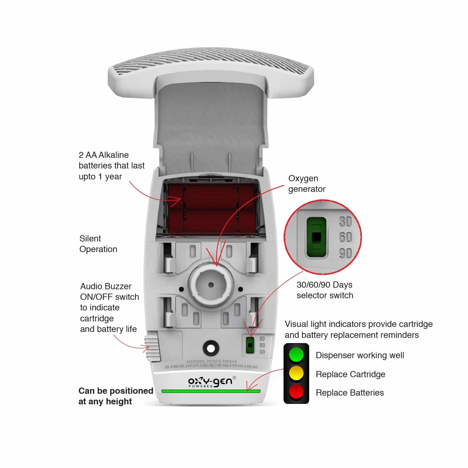 Oxygen-Pro is a continuous fresh scent and odour control system that is reliable, effective, safe and eco-friendly. Oxygen-Pro is the only technology that delivers fragrance into the air continuously, consistently and accurately for the entire duration of the cartridge life, and without the use of aerosols. Oxygen-powered system – Delivers continuous, consistent fragrance every day