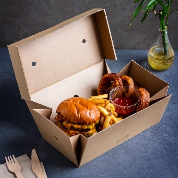 Fold-out premium burger meal box. For burger meals – think burger and wedges, fish and chips, wings and onion rings. The practical fold-out design turns the box into a plate for dining. Good quality thickness, made from recycled unbleached board. Plain kraft brown with on-product eco messaging in Vegware green. Award-winning design by Vegware, made from plants. Designed for industrial composting, made from recyclable materials.