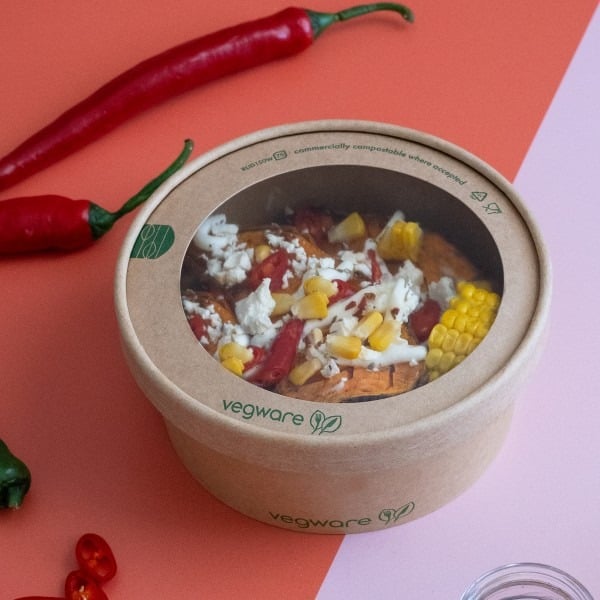Kraft paper lid with cellophane window for 150-Series food containers. Perfect for displaying your hot street food. Made from sustainably-sourced paper with a cellophane window. Brown kraft paper with transparent cellophane window in the centre. Award-winning quality by Vegware, made from plants. Designed for industrial composting.